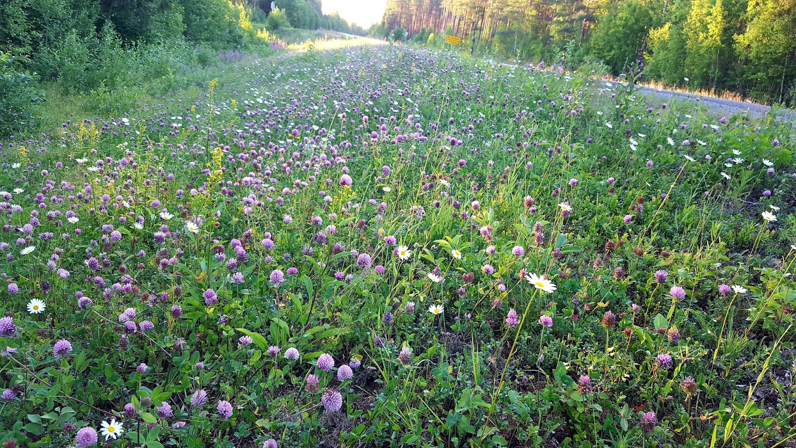 As we traveled, we noticed that the roadside was covered with wild flowers. Lengthy patches, at first, then long stretches and fields covered with them. The flowers seemed to be mostly the tall plants with violet/pink blossoms, but mixed with a variety of other flowers that created gigantic bouquets.